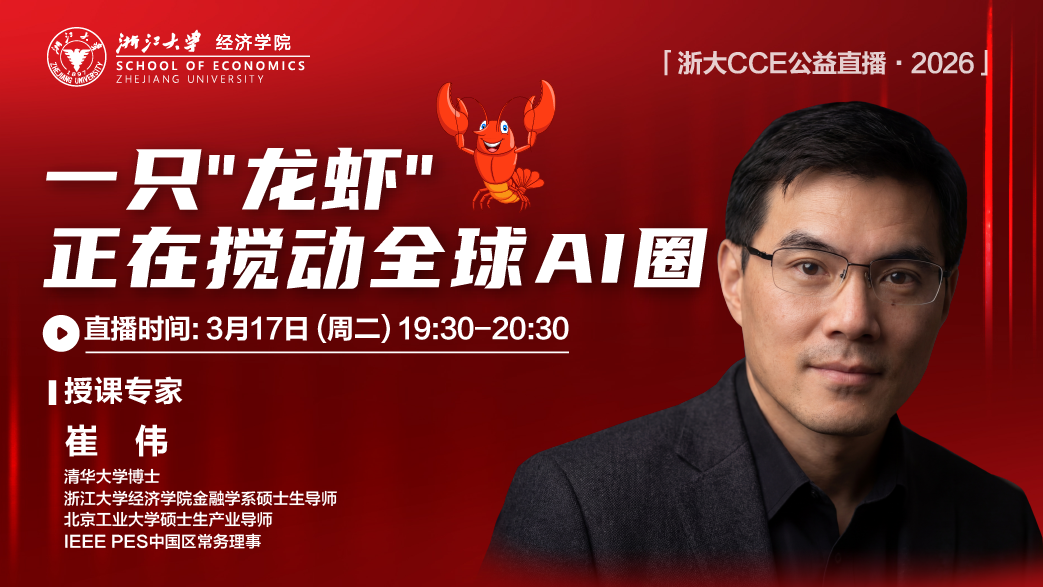 3月17日(明晚)19:30-20:30,浙江大学经济学院进行公益直播,特别邀请清华大学博士、浙江大学金融学系硕士生导师、IEEE PES中国区常务理事崔伟,为大家分享《这只"龙虾"缘何搅动全球AI圈——OpenClaw现象背后的技术变革与社会启示》,也希望你能够在聆听中,找到自己的更多观点。